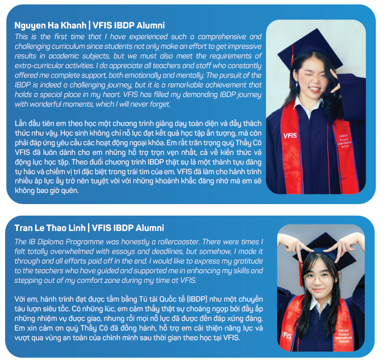 Vietnam-Finland International School (VFIS) operates under a not-for-profit model as part of Ton Duc Thang University. VFIS is proud to be recognized by the International Baccalaureate Organization (IBO) as one of its global IB schools and is officially authorized to offer the International Baccalaureate Diploma Programme. The IB community shares a commitment to high-quality, challenging international education, empowering students to take charge of their futures and build successful careers, regardless of where they choose to live and work.