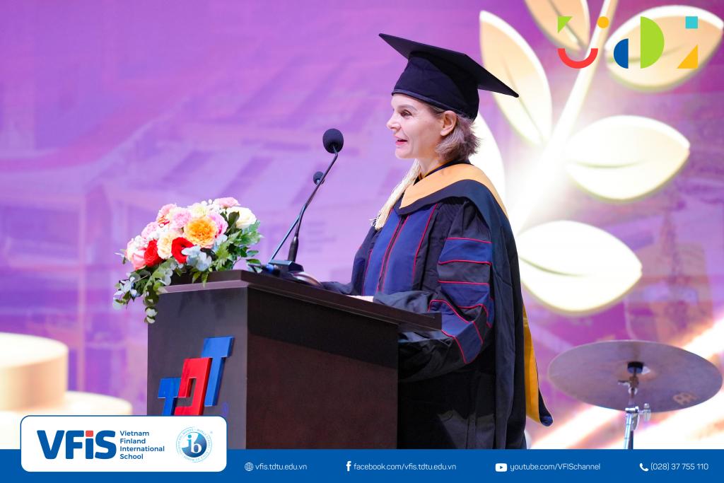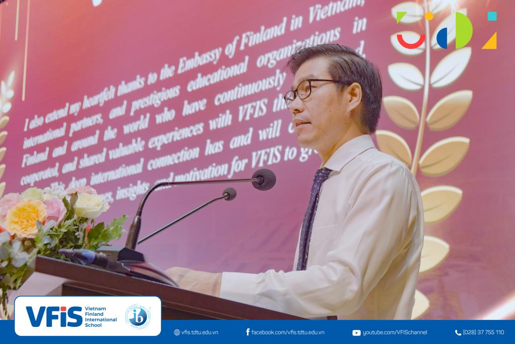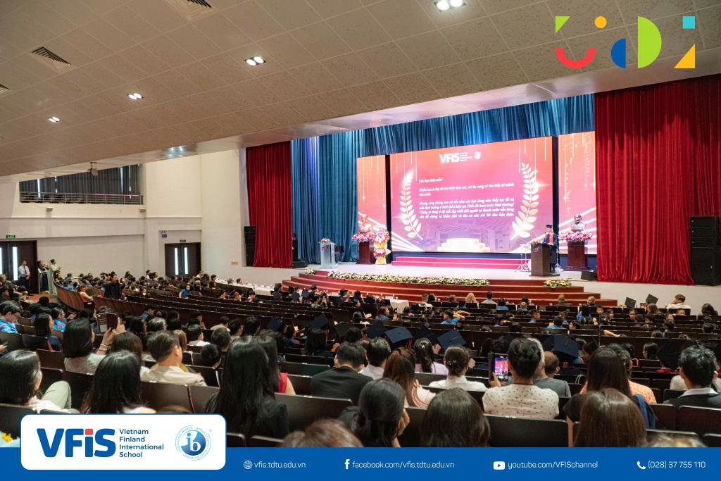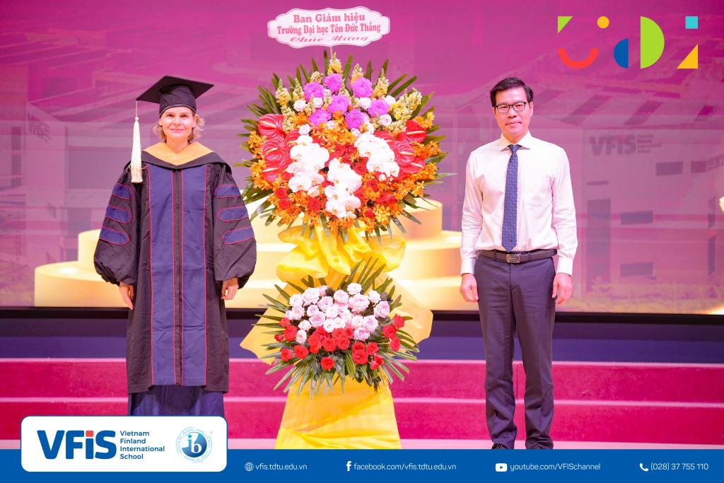 Attending the ceremony were Ms. Phạm Ngọc Nhi – Deputy Head of the Department of Education and Training of District 7; Dr. Tran Trong Dao – President of TDTU; Dr. Vo Hoang Duy – Vice President of TDTU; Mr. Quan Gia Binh (M.A.) – Director of the VFIS Executive Board; Ms. Miekk-Oja Suvi Kristiina (M.A.) – Head of VFIS; along with nearly 1,000 VFIS teachers, parents, and students.